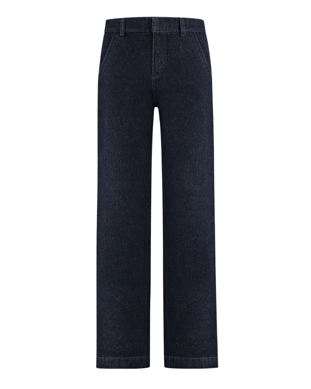 Calça em jeans lavagem amaciada corte alfaiatado reto cintura alta cós com passante fechamento colchete e zíper com bolso na lateral e bolso alfaiataria atrás