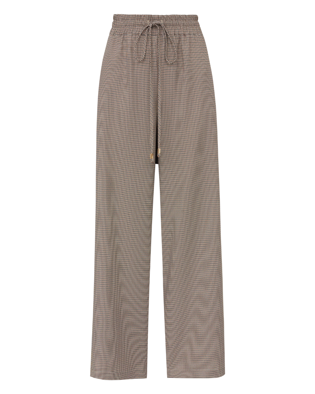 Calça em crepe estampado pied de poule elástico no cós com corda reguladora para amarração bolo na lateral